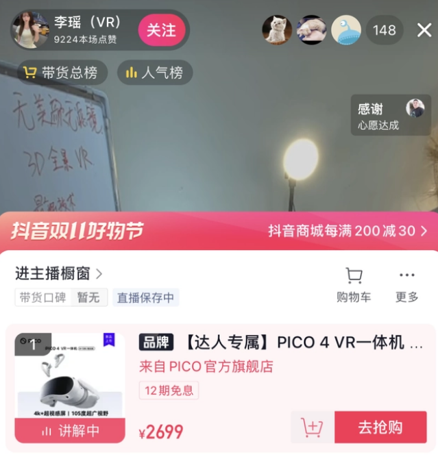 这里的“眼镜”是指VR一体机设备,又称VR眼镜,将其戴在头上就能观看360度全景的VR直播。李瑶(VR)直播间的小黄车里就挂着这样一款产品:VR眼镜品牌PICO最新的PICO4。